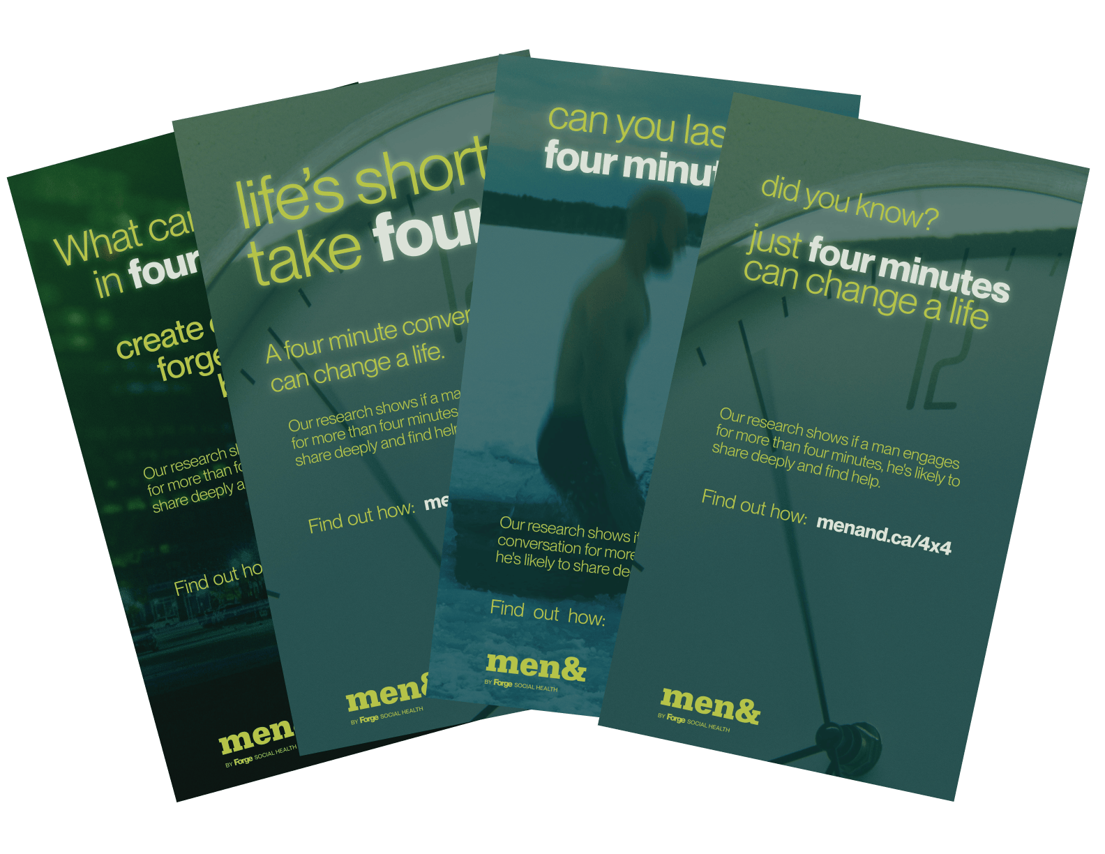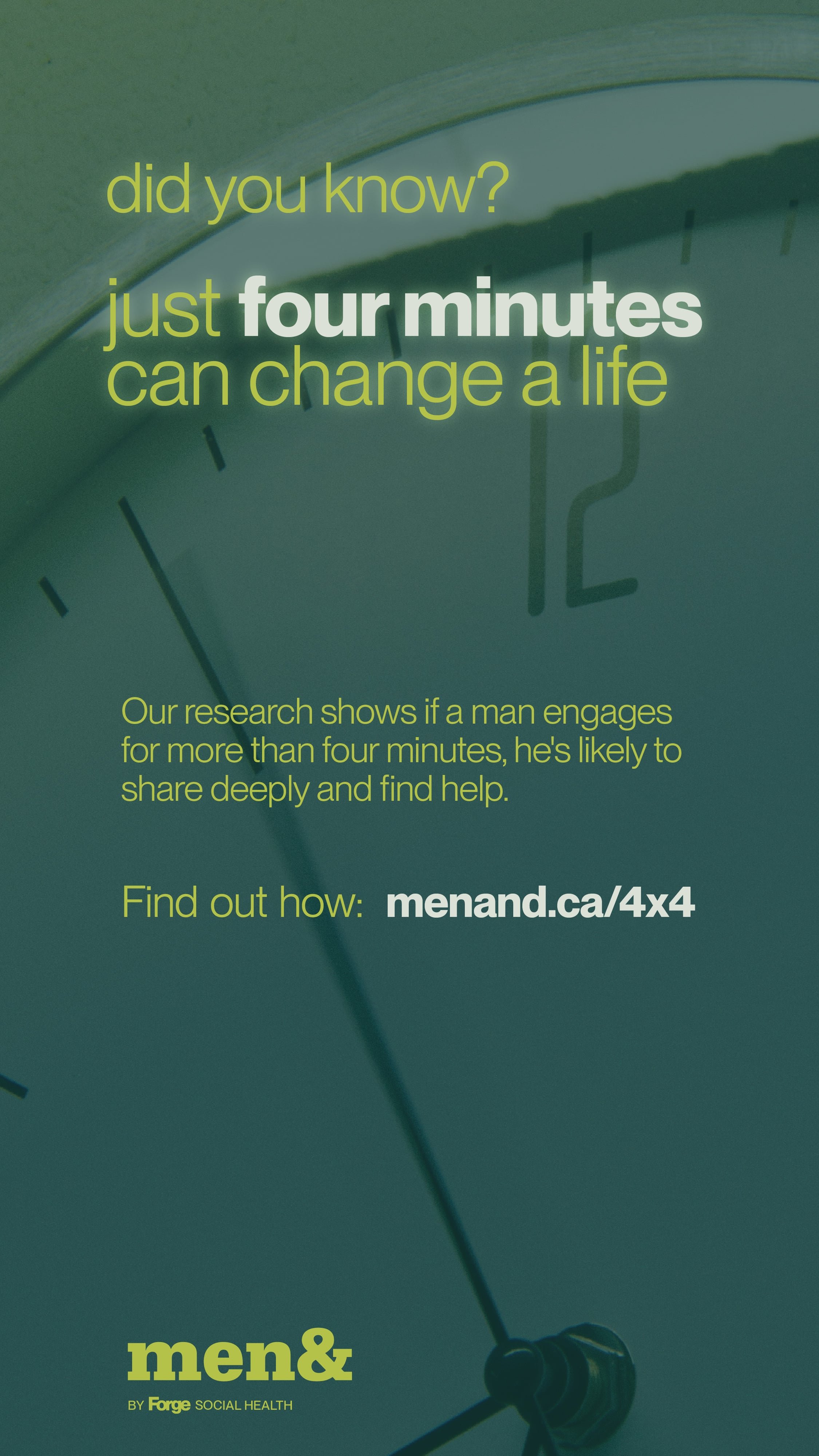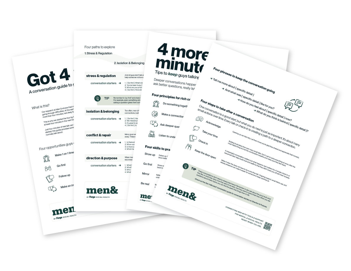 This month, take the four by four challenge: check in with four guys for at least four minutes in the next four weeks about their mental health and relationships.